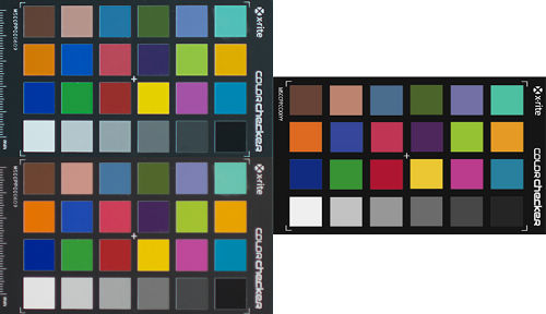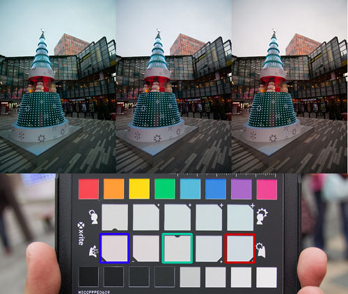 DNG配置文件的實(shí)際效果如何?色卡本身的照片非常具有說服力,下圖1、2、3是同一張RAW輸出的不同結(jié)果,左上方是Lightroom里的默認(rèn)輸出,左下方則是套用根據(jù)這張照片制作的DNG配置文件后的結(jié)果,右側(cè)是作為對(duì)比的標(biāo)準(zhǔn)色卡電子文件。很明顯,矯正后的各個(gè)色塊更貼近實(shí)際應(yīng)有的色彩表現(xiàn)。