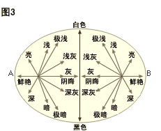 | 再來說說黃色。檸檬的黃色和梨的黃色相比較又如何? 你可能會說檸檬的黃色更明亮一些,但除此以外還有一個大的差別就是檸檬的黃色顯得鮮艷, 而梨的顏色則顯得陰晦。 這種差別稱之為色飽和度或鮮艷度。 從圖2可以看出,紫紅和綠兩色的飽和度分別由中心向兩側隨水平距離的增加而變化。 離中心越近,色彩越陰晦;離中心越遠,則越鮮艷。 圖3標出了一些常用的描述色彩亮度和色飽和度的形容詞。 至于這些形容詞表達了什么,請再看一下圖2。 | |