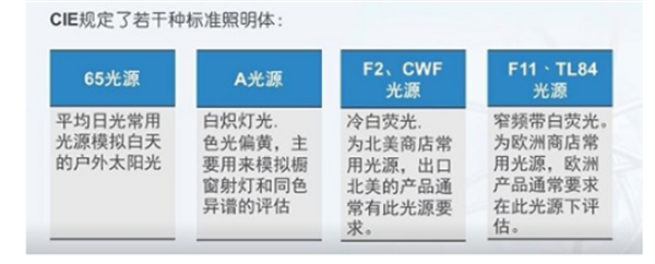 CIE規(guī)定了若干種標準照明體,來模擬不同應用場景下的光源,相同一個樣品在不同的照明體下計算得出的顏色數(shù)據(jù)是不同的。選擇一種與目視評估使用光源類型一致的標準照明體,才會得到相一致的結果。比如目視是在在戶外或者燈箱D65照明下,儀器中就要選擇對應的D65標準照明體。