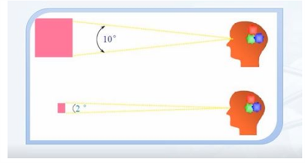 視角又叫標準觀察者,是指CIE制定標準時樣品在觀察者眼睛中投影的夾角,有兩個標準,一個是2°,另外一個是10°。2°對應于小樣品或遠觀樣品,10°對應于大樣品或近看樣品。如果評估產品面積很大,而儀器中選擇了2°視角,就容易出現(xiàn)不匹配的情況。