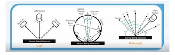 色差儀常用的有三種幾何結構,包括0°/45°,d/8°和多角度,其中d/8°還有包含鏡面反射狀態(tài)和排除鏡面反射狀態(tài)。同一個樣品使用不同的幾何結構的分光光度儀測量得到的結果是不同的。為了達到與目測結果一致,建議按照如下原則選擇儀器和設置: