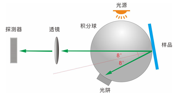 當(dāng)光線進(jìn)入積分球后,會(huì)在球壁上多次反射,然后從測(cè)量孔或光源孔射出積分球。一束光從任意的不通過(guò)球心的角度照進(jìn)積分球,經(jīng)過(guò)球壁的多次反射后,會(huì)從各個(gè)角度照射到樣板,最終通過(guò)測(cè)量孔或光源射出積分球。測(cè)量孔是在與法線夾角成8°的位置,由一組光電管構(gòu)成的探測(cè)器。