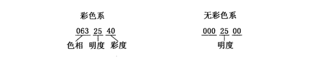 對于彩色系的滌綸繡花線,顏色的標號由7位數字組成,前3位數字表示對應的色相,第4、5位數字表示對應的明度,后2位數字表示對應的彩度。