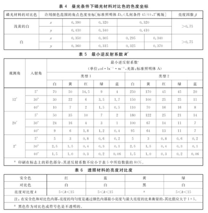 含有逆反射材料的最小逆反射系數如表5所示,