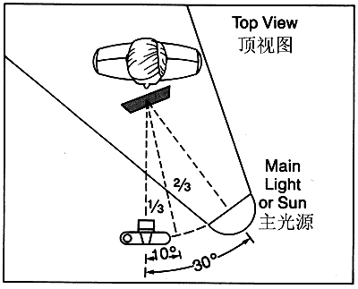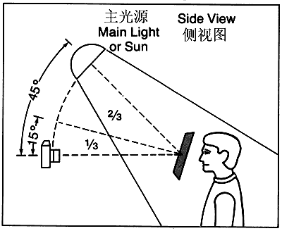 在人工光源條件下,將灰卡置于盡可能接近被攝對象的位置上。將灰卡的表面正對相機和主光源夾角的1/3方向。舉例說明,若主光源位于相機右側30度及相機與被攝對象連線的上方45度角度位置,那么應當將灰卡表面對準相機右側10度和上方15度的方向。參見圖1和圖2。