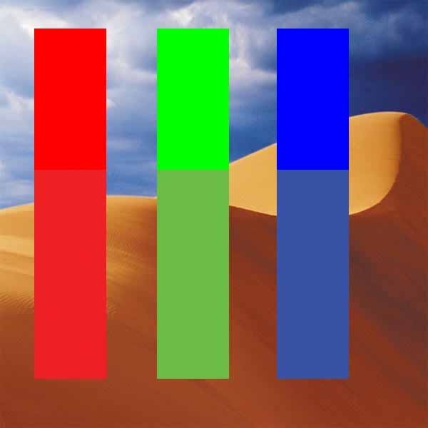 圖像中上半部分為標準的RGB三色,下半部分為轉換成CMYK以后的變化。您可以親自做一次這個試驗:先在RGB圖像中分別填充三個色塊:R255、G255、B255,然后連續按Ctrl+Y鍵,在RGB與CMYK兩種模式之間反復轉換,觀察它們的差別。